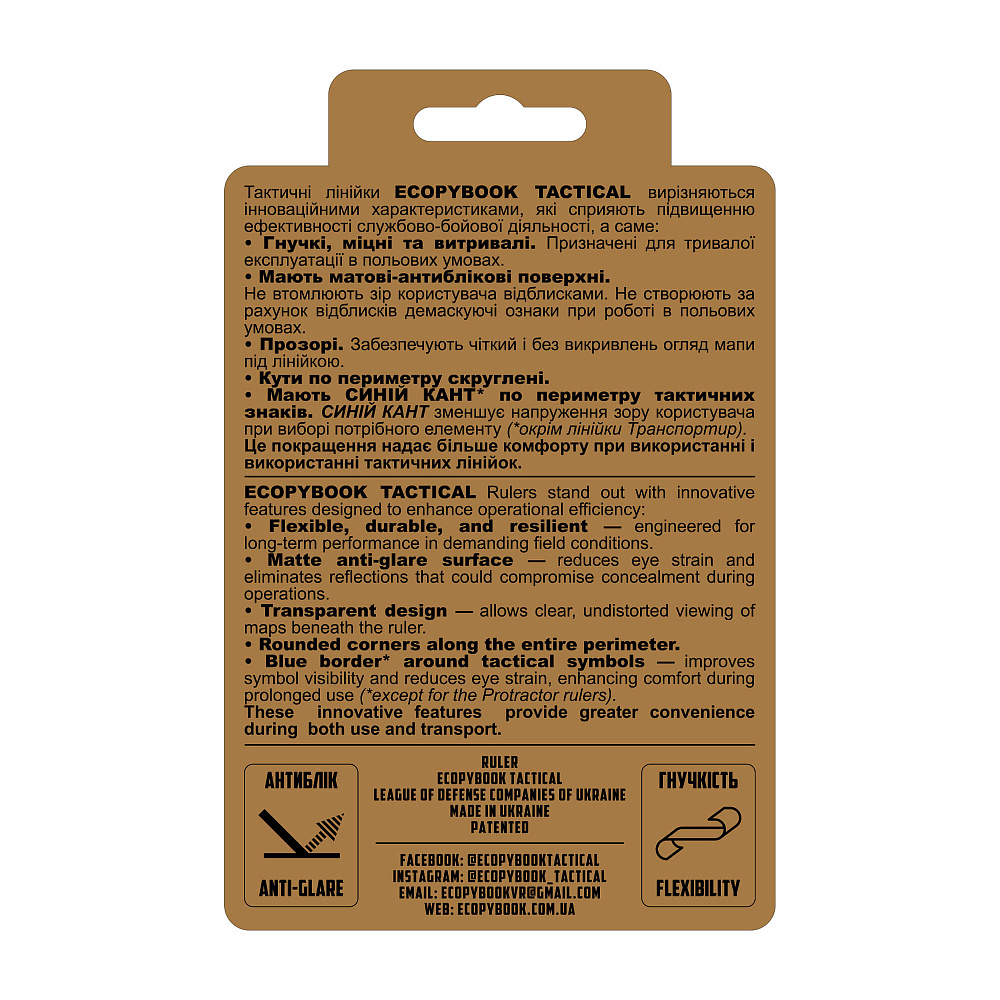 Ecopybook taktikaline joonlaud TZ NATO on mõeldud taktikalisteks kasutamiseks välitingimustes. Päikesekiired on üks lahinguvälja paljastamise teguritest, seega on mittepeegeldavate pindade olulisus oluliselt suurenenud UAV-de õhuuuringute suureneva kasutamise kontekstis. Erinevalt teistest läikivatest joonlaudadest on see mudel valmistatud läbipaistvast ja paindlikust materjalist, millel on peegeldusvastased omadused. See aitab vältida päikesekiirte peegeldust ja vähendada vaenlase tuvastamise riski teie positsioonide suhtes. Peegeldusvastase pinna tõttu ei peegelda see päikesekiiri, mis vähendab oluliselt paljastamise tegureid. Omadused: Matt peegeldusvastane pind Läbipaistev Paindlik Materjal: Polümeerid Mõõtmed: 14,5 x 10,5 cm