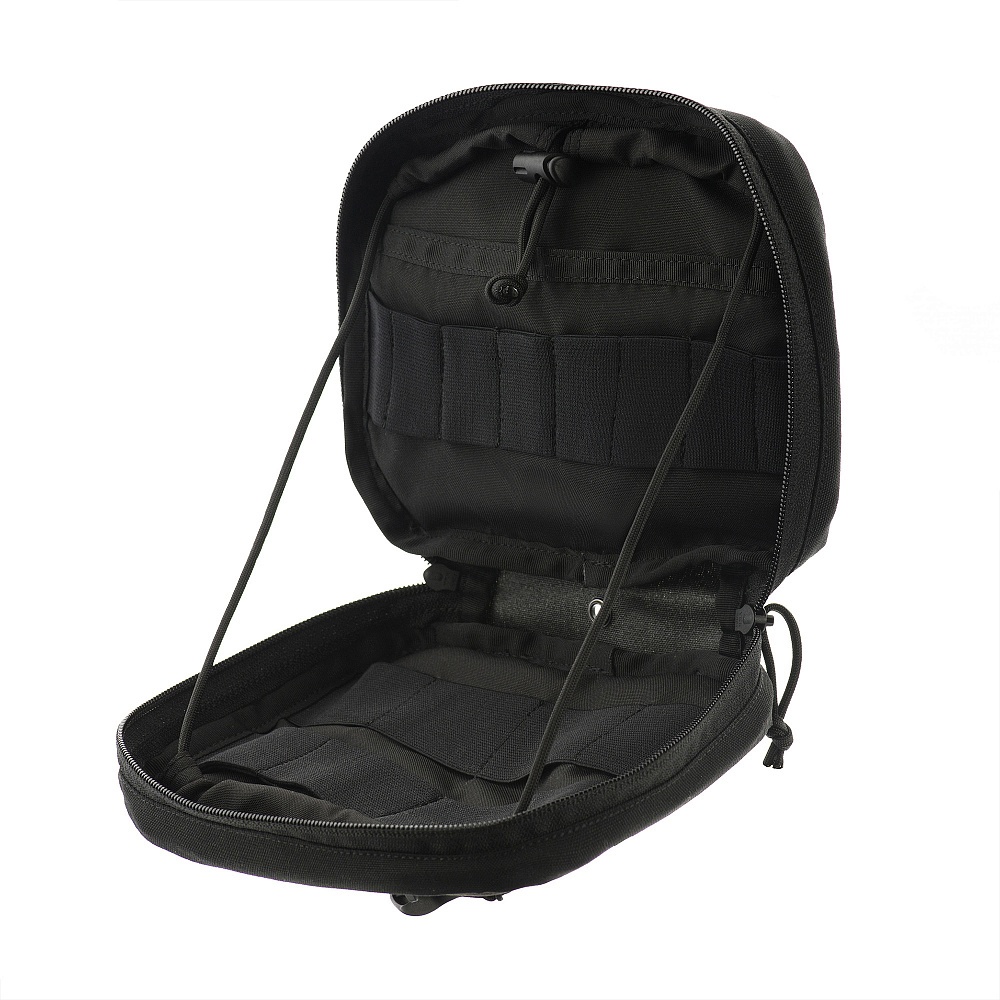 Universaalne taktikaline hoidja M-Tacilt esmaabi komplekti, EDC komplekti (pastapliiats, nuga, taskulamp, märkmik, mitmeotstarbeline tööriist jne) ja NAZ (kasulik hädaabi varustus) kandmiseks. Kott kinnitatakse seljakottidele, taktikalistele vestidele M.O.L.L.E. süsteemiga. See avaneb 90 kraadi (paracord on paigutatud mõlema tray poole sisepinnale, hoides seda avatud). Omadused: – Üks suur sisemine tasku – Mitmed elastsed rihmad tööriista (nuga, taskulamp, tulekivi jne) kinnitamiseks tray sees – Üks väline tasku lukuga – Ventilatsiooni ja drenaaži jaoks avad põhjas – Võime avada 90 ° nurga all, kinnitatud reguleeritava paracord kinnitussüsteemiga: M.O.L.L.E. Mõõtmed: 19 x 16 x 6,5 cm Materjal: 500D CORDURA Tarvikud: YKK