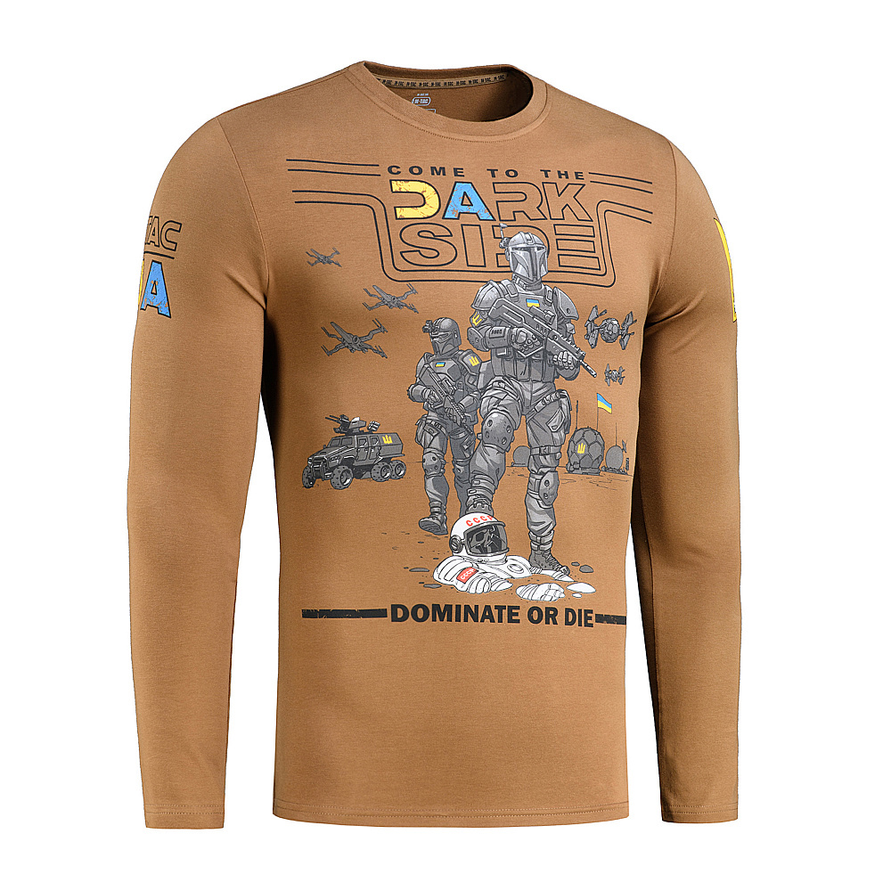 The original M-Tac UA Side long sleeve T-shirt is the best investment in your closet. The model is made of high-quality, wear-resistant knit fabric: 93% cotton, 7% elastane. This material is pleasant to the body, does not fray and does not lose its shape after washing. The main part of the print on the chest reads “Go to the dark side” and below it “Dominate or perish” with an original image of Ukrainian cosmonauts with rifles standing on the corpses of Soviet enemies. The sleeves feature the beautiful “M-Tac UA” logo on one side and the Ukrainian coat of arms with the “Dark Side” warrior on the other. The T-shirt is best suited for active recreation and sports, so it will work well for hunters, fishermen, hikers and lovers of various sports. Thin elastic and high-quality knitted fabric impressively emphasize the assets of the figure and give a feeling of complete comfort. Material: -93% cotton -7% elastane